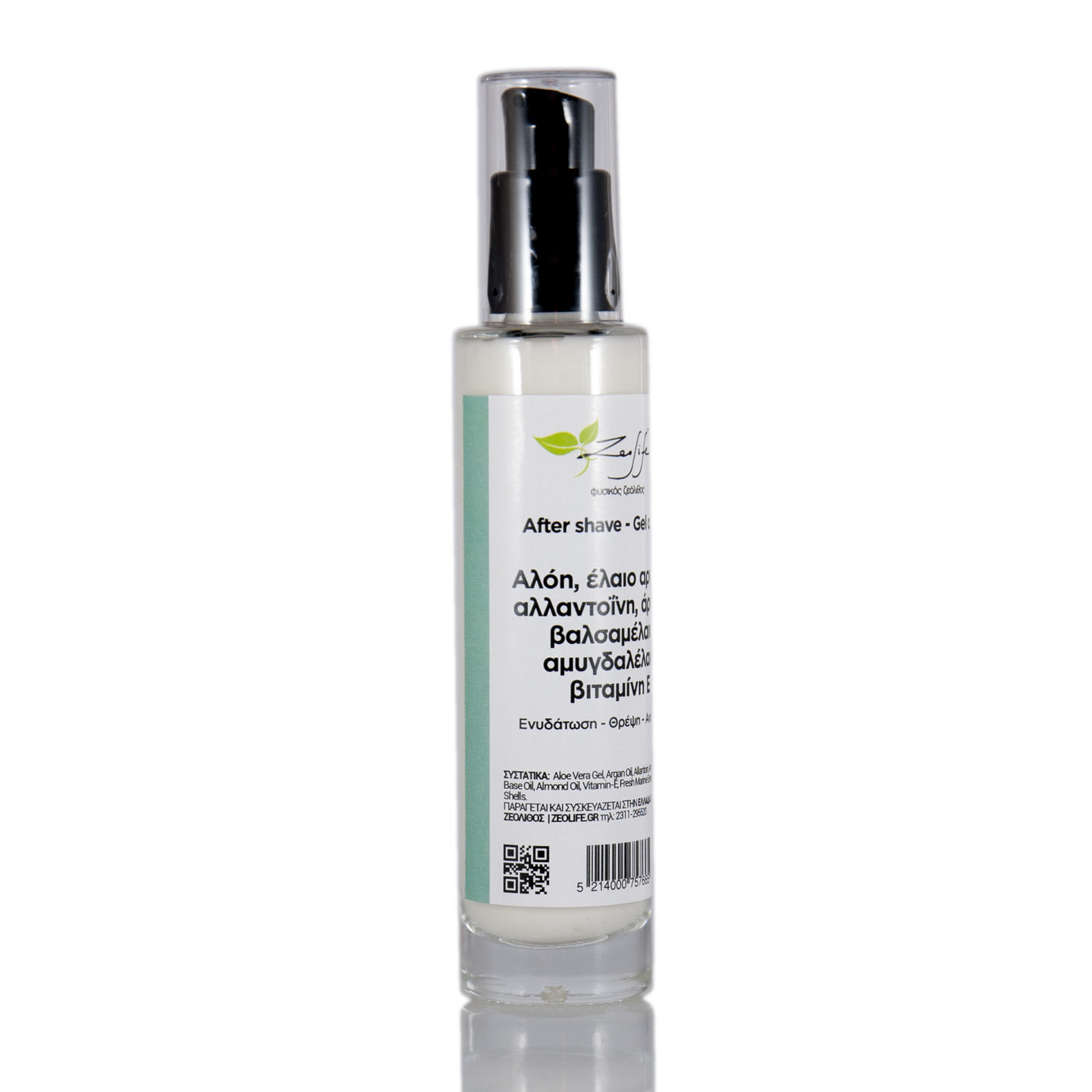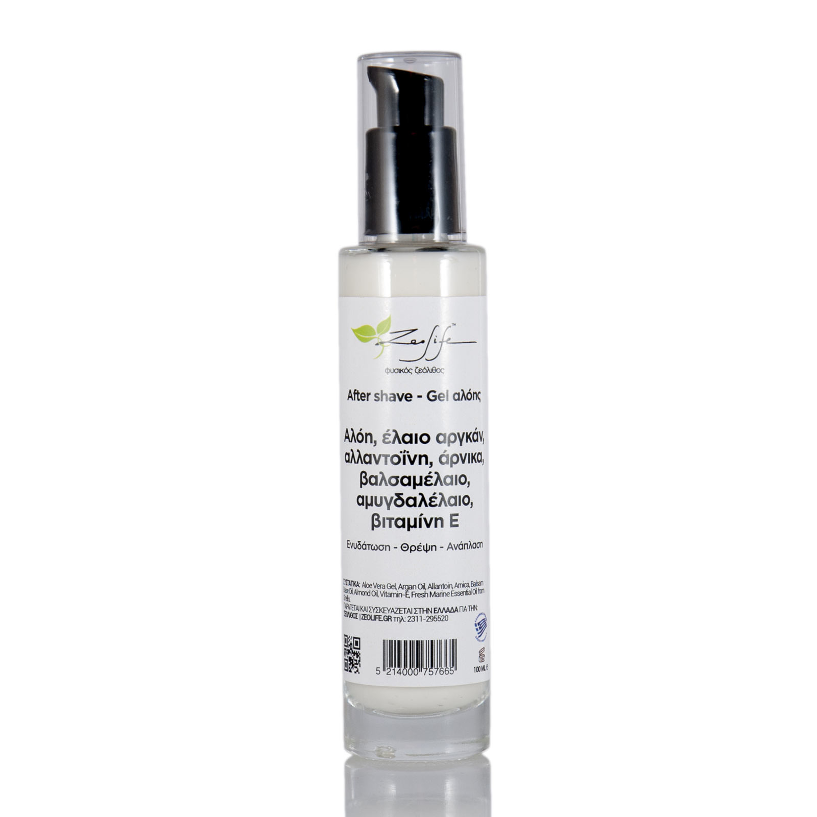 After shave gel με αλόη, έλαιο αργκάν, αλλαντοΐνη, άρνικα, βαλσαμέλαιο, αμυγδαλέλαιο και βιταμίνη Ε, των 100ml, το οποίο συσκευάζεται σε γυάλινο περιέκτη με πατητό πώμα.
