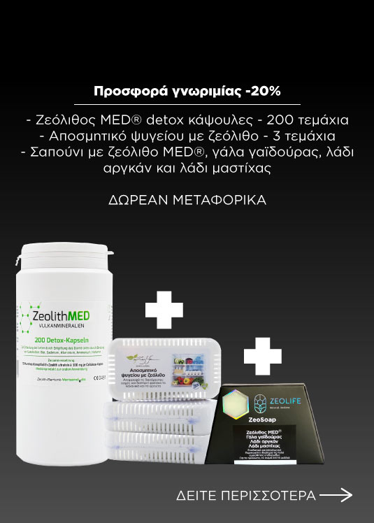 – Ζεόλιθος MED® detox εξαιρετικά λεπτή πούδρα έως 10 μικρά – Κάψουλες, ο οποίος εξορύσσεται στη Σλοβακία, σε ένα από τα πιο υψηλής περιεκτικότητας κοιτάσματα στην Ευρώπη. Η επεξεργασία του πραγματοποιείται στην Αυστρία, όπου ο ζεόλιθος μικροϊονίζεται σε εξαιρετικά λεπτό βαθμό και ενεργοποιείται με μια πολύ ιδιαίτερη διαδικασία. Ωστόσο η φυσική δομή του κρυσταλλικού πλέγματός του παραμένει άθικτη. Ως αποτέλεσμα της διαδικασίας αυτής, αυξάνεται η εσωτερική επιφάνεια του έως και 600 τ.μ./gr, που σημαίνει ότι μπορεί να απορροφήσει περισσότερες επιβλαβείς ουσίες πιο αποτελεσματικά και στη συνέχεια να εκκριθούν με φυσικό τρόπο.