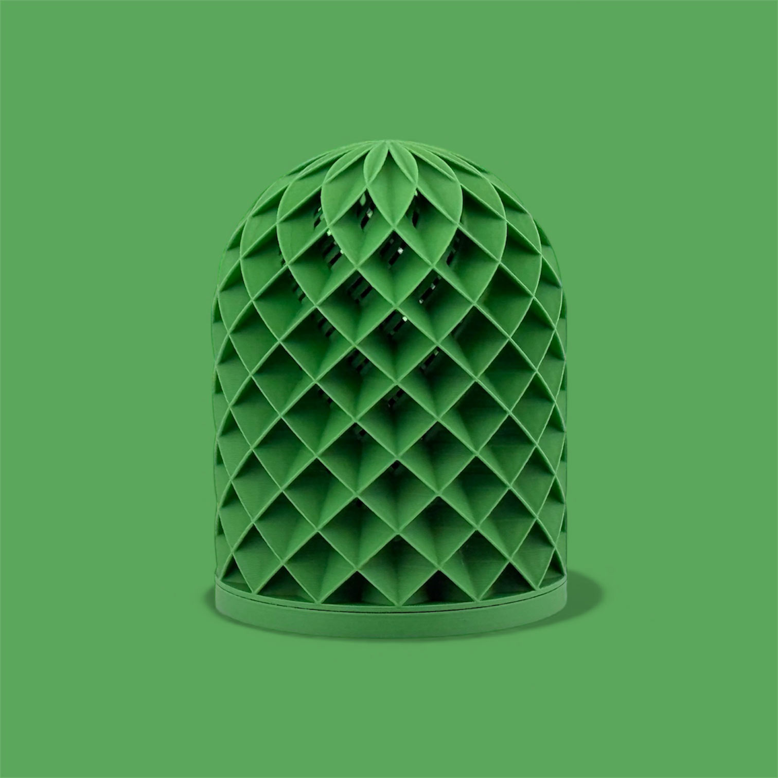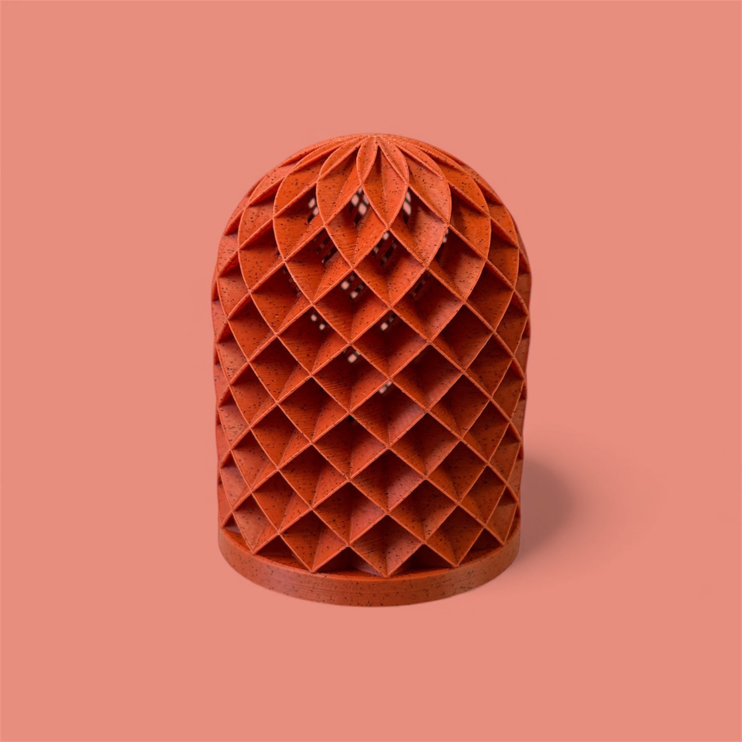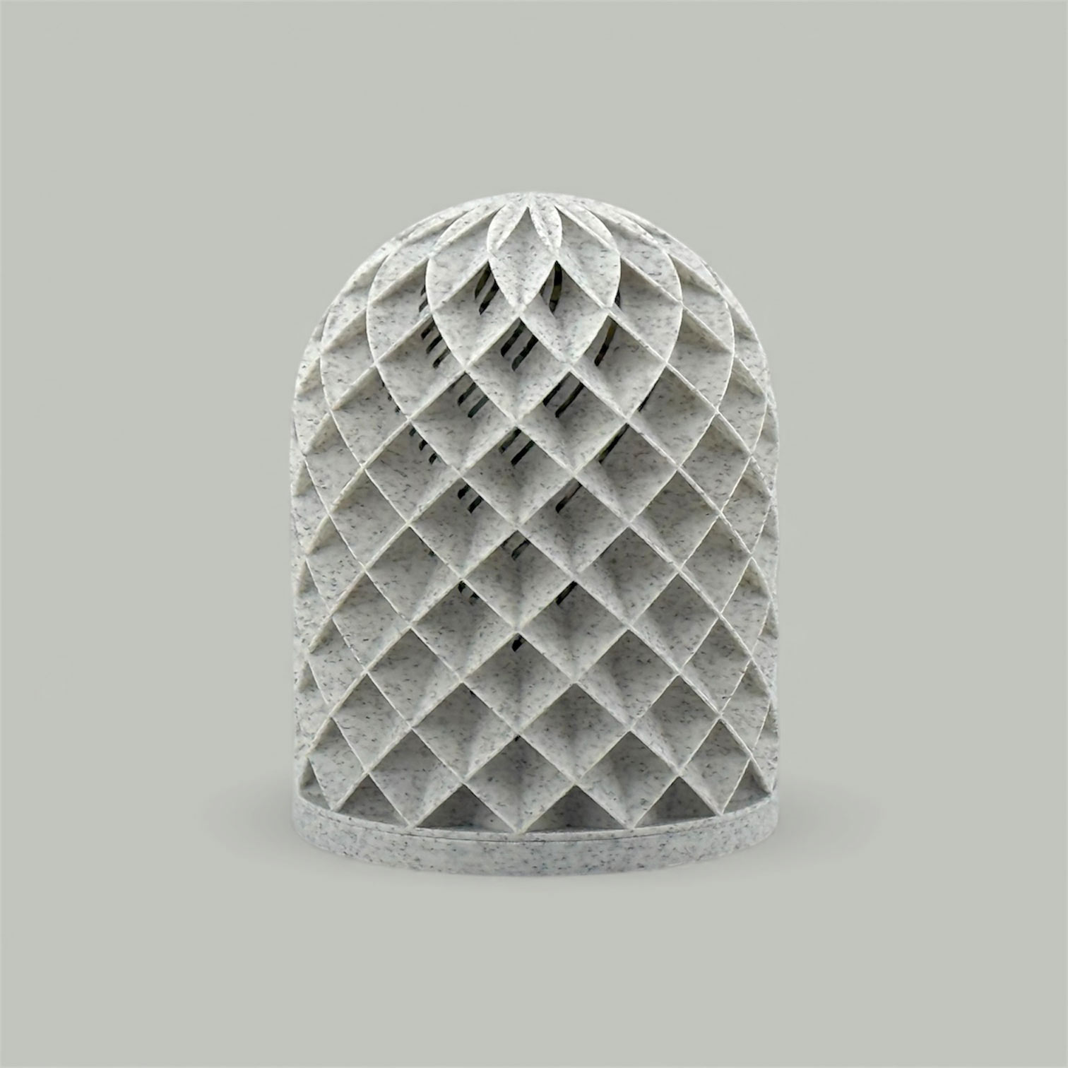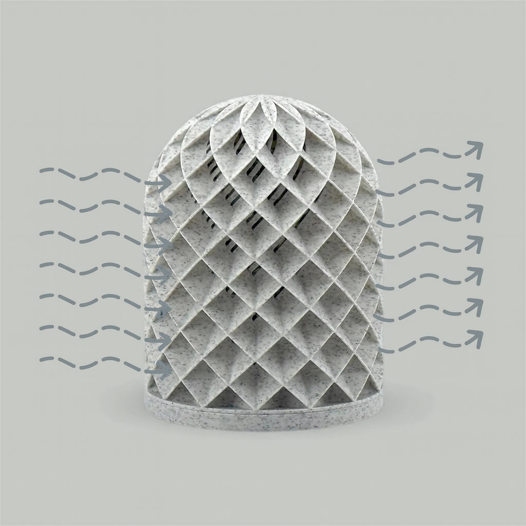 Το εξωτερικό κέλυφος παράγεται από ανακυκλώσιμο PLA και κατασκευάζεται με τεχνολογία 3D printing, εξασφαλίζοντας χαμηλή ενεργειακή κατανάλωση και σχεδόν μηδενική σπατάλη υλικού. Κάθε κομμάτι είναι μοναδικό και διατίθεται σε ποικιλία minimal και μοντέρνων χρωμάτων.