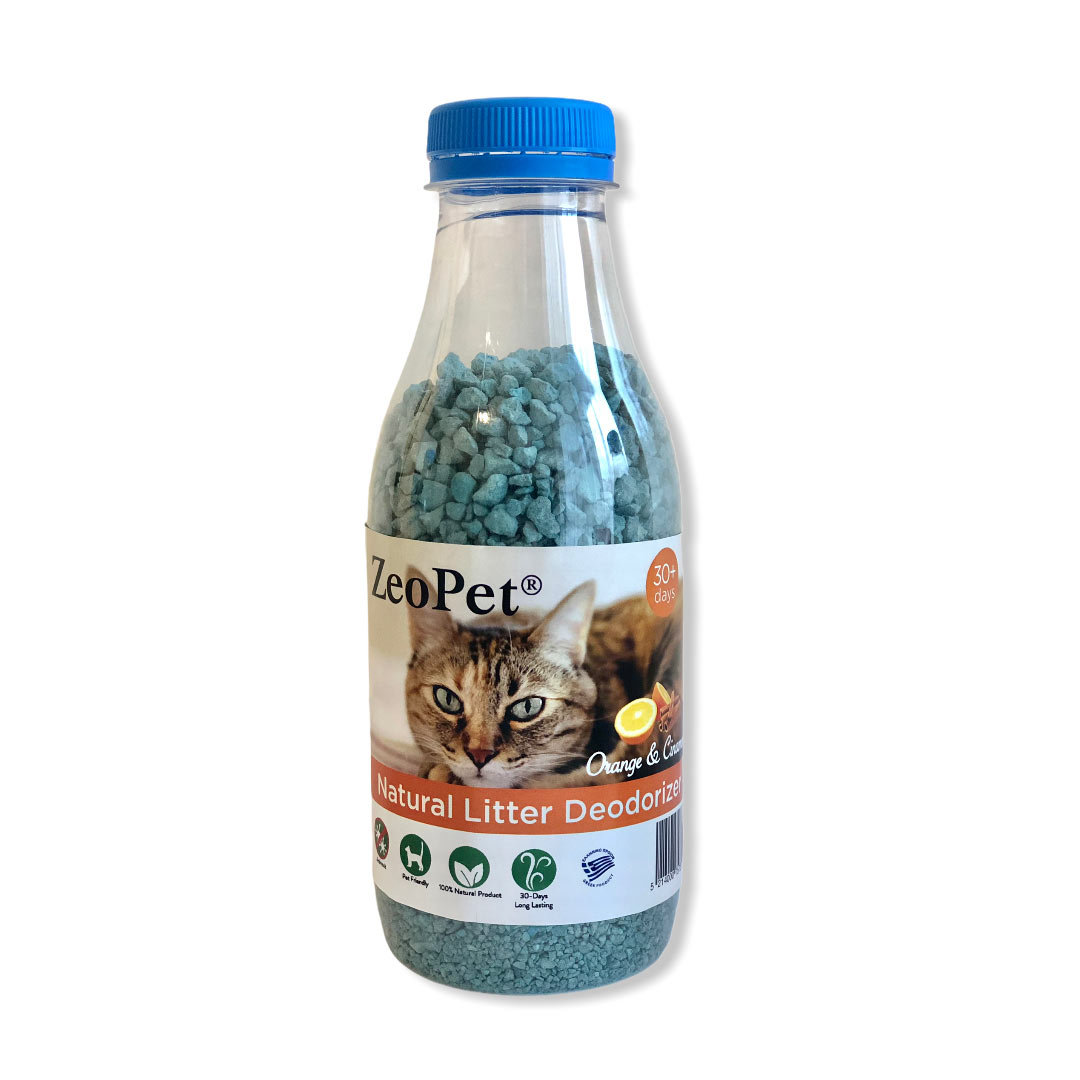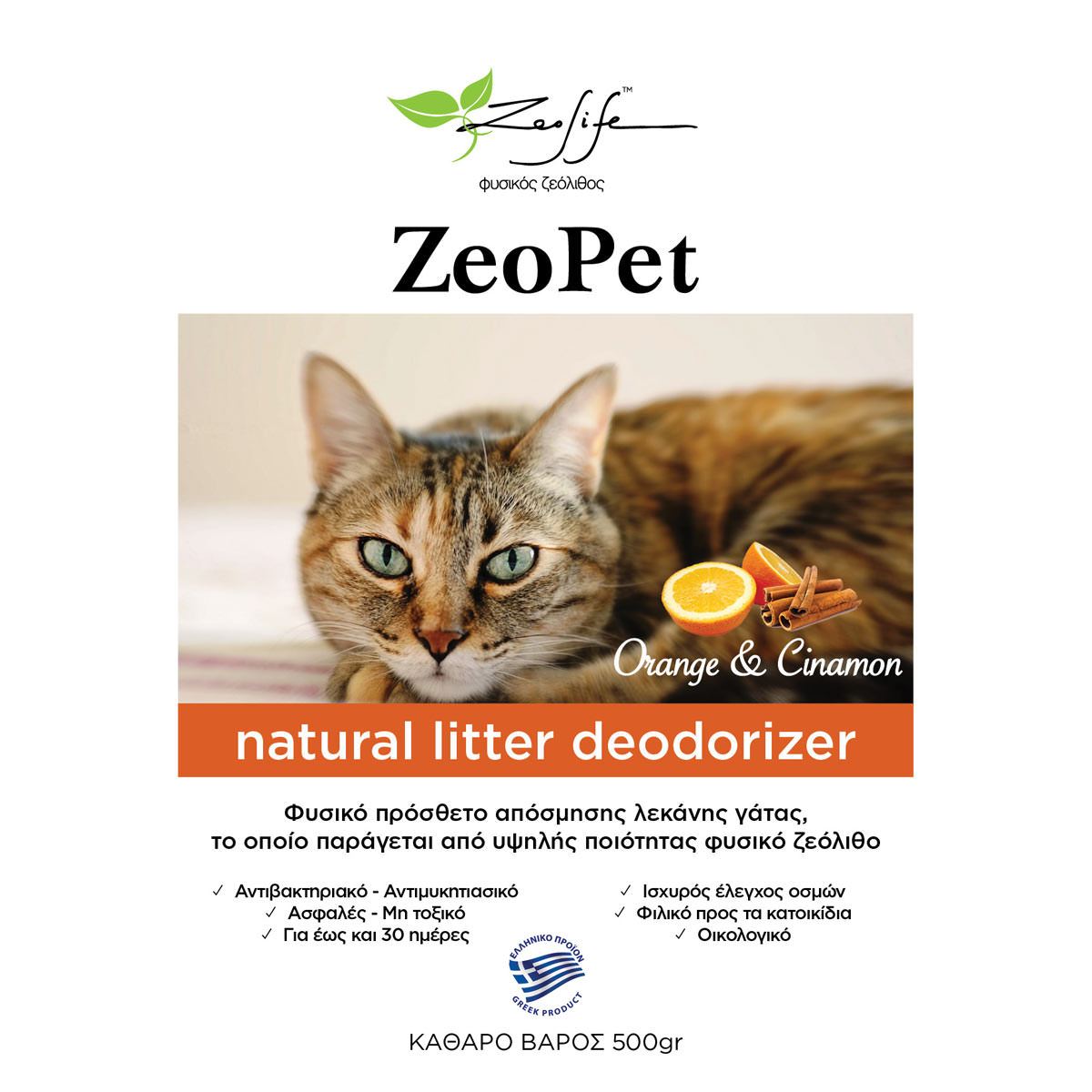 Το ZeoPet με άρωμα πορτοκάλι και κανέλα είναι ένα καινοτόμο προϊόν, το οποίο χρησιμοποιείται ως πρόσθετο υλικό στη λεκάνη της γάτας. Παράγεται από 100% πιστοποιημένο φυσικό ζεόλιθο και έχει τη μοναδική ικανότητα να απορροφά τις δυσάρεστες οσμές. Παράλληλα συμβάλει στην διατήρηση του υγιεινού περιβάλλοντος, εμποδίζοντας την ανάπτυξη μυκήτων, βακτηρίων, παρασίτων και ακάρεων.