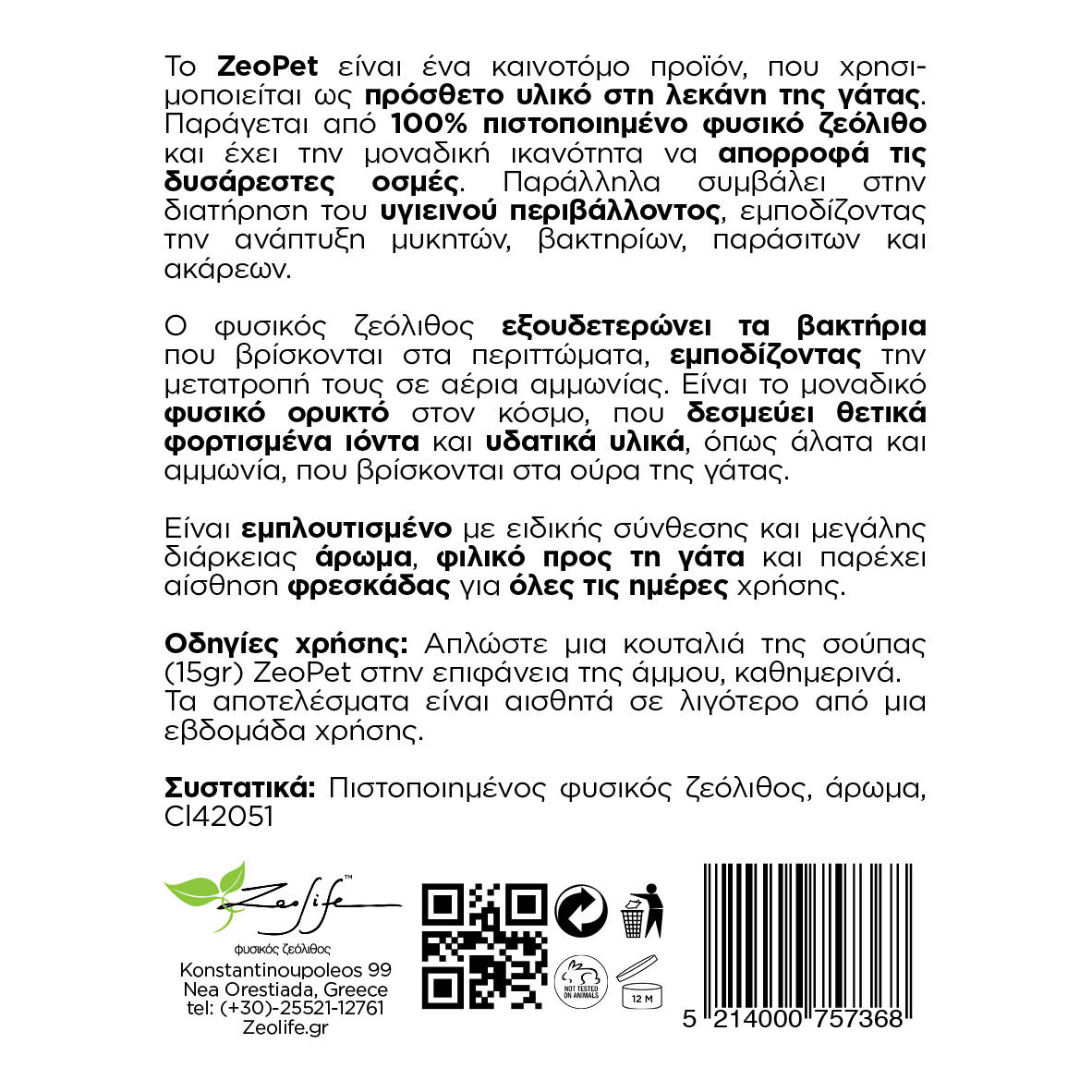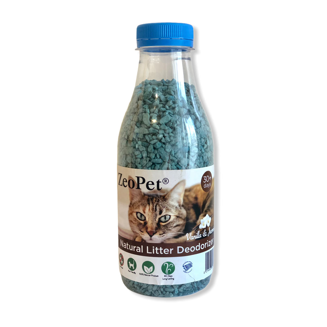 To ZeoPet με άρωμα βανίλια και γιασεμί είναι ένα καινοτόμο προϊόν, που χρησιμοποιείται ως πρόσθετο υλικό στη λεκάνη της γάτας. Παράγεται από 100% πιστοποιημένο φυσικό ζεόλιθο και έχει τη μοναδική ικανότητα να απορροφά τις δυσάρεστες οσμές. Παράλληλα συμβάλει στην διατήρηση του υγιεινού περιβάλλοντος, εμποδίζοντας την ανάπτυξη μυκήτων, βακτηρίων, παρασίτων και ακάρεων.