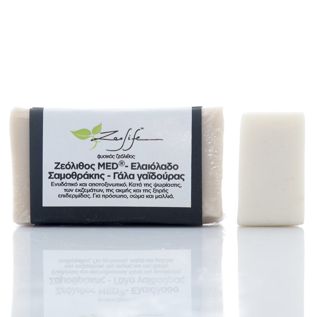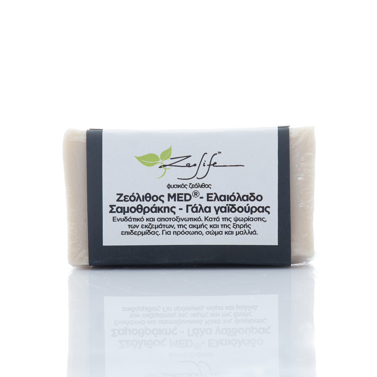 Σαπούνι με ζεόλιθο MED®, ελαιόλαδο Σαμοθράκης και γάλα γαϊδούρας, το οποίο έχει παραχθεί από φυσικές πρώτες ύλες, φιλικές προς τον άνθρωπο και το περιβάλλον. Ο ζεόλιθος, το φυσικό αποτοξινωτικό προϊόν της φύσης, συνδυάζεται άριστα με το ελαιόλαδο Σαμοθράκης και το γάλα γαϊδούρας. Ο μοναδικός αυτός συνδυασμός αναδεικνύει τις αποτοξινωτικές και ενυδατικές ιδιότητες των συστατικών αυτού του σαπουνιού. Μοναδικό στην αναζωογόνηση και προστασία των επιδερμίδων δημιουργώντας απαλό και κρεμώδη αφρό. Χρησιμοποιείται σε όλο το σώμα, το πρόσωπο και τα μαλλιά. Δεν περιέχει σιλικόνη, parabens και φοινικέλαιο.