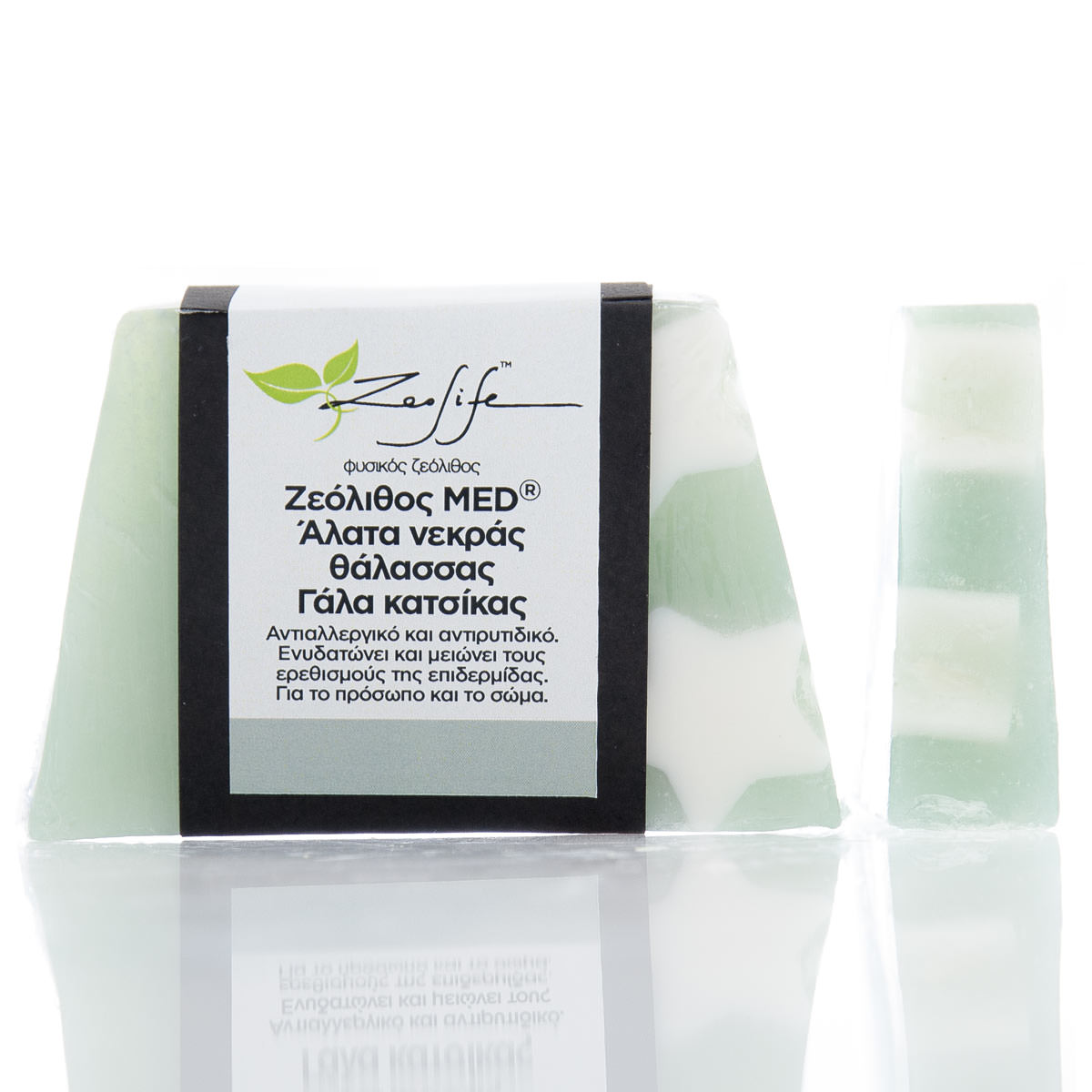 Σαπούνι με ζεόλιθο MED®, άλατα νεκράς θάλασσας, βούτυρο καριτέ και γάλα κατσίκας, το οποίο έχει παραχθεί από φυσικές πρώτες ύλες, φιλικές προς τον άνθρωπο και το περιβάλλον. Ο ζεόλιθος, το φυσικό αποτοξινωτικό προϊόν της φύσης, συνδυάζεται άριστα με τα άλατα νεκράς θάλασσας και το γάλα κατσίκας. Ο μοναδικός αυτός συνδυασμός καθιστά αυτό το σαπούνι μοναδικό στην καταπολέμηση των αλλεργιών και των ρυτίδων. Η χρήση του παρέχει θετική επίδραση στους ρευματισμούς, τη ρευματοειδή αρθρίτιδα και την οστεοαρθρίτιδα. Είναι επίσης ενυδατικό και μειώνει τους ερεθισμούς της επιδερμίδας. Χρησιμοποιείται σε όλο το σώμα και το πρόσωπο. Δεν περιέχει σιλικόνη, parabens και φοινικέλαιο.